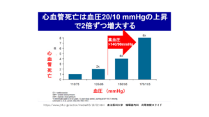 では血圧上がると何が良くないかと言いますと、脳や心血管病といった重い病気のリスクが上がります。